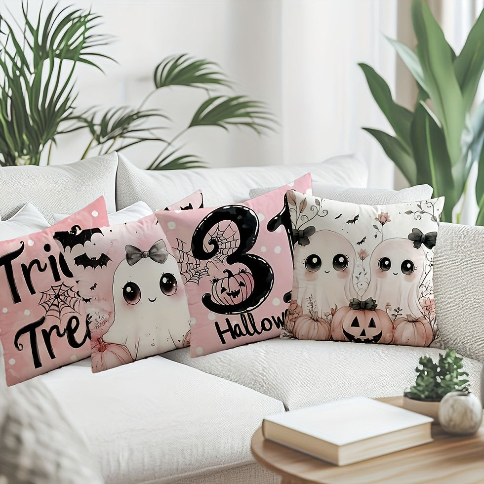 4-piece Halloween Pillow Set: Witch Pumpkin Black Cat Pattern, Zipper, Machine W